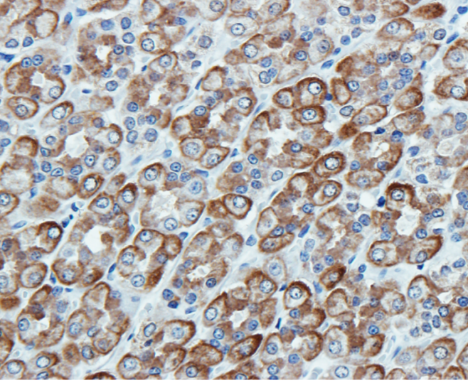 Immunohistochemical staining of rat stomach tissue using anti-CD38 (2.5 ug/ml)